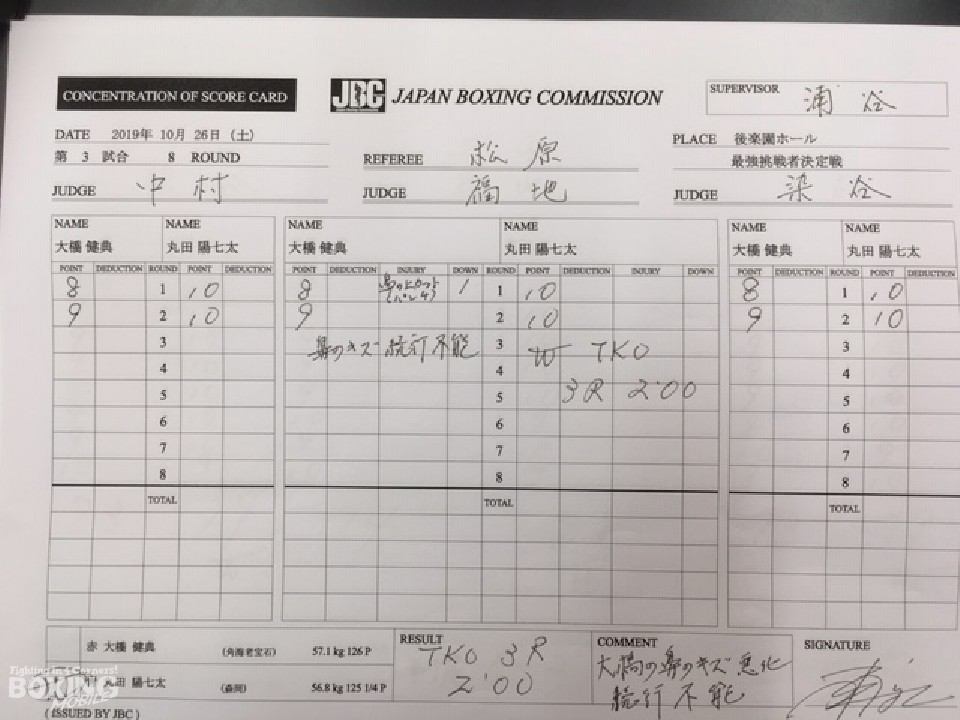 丸田が遠い距離からジャブを飛ばして距離を測ると左フックを炸裂させてダウンを先取。ジャブを浴びた大橋は鼻から大量の出血をした。2回、丸田は上下に的確に打ち分けて攻勢。3回、丸田が優勢に進めたところで2度目のドクターチェックが入りレフェリーストップとなった。
