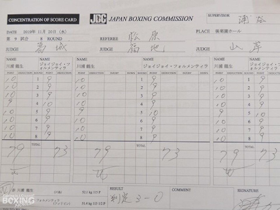 サウスポー同士の対戦は、ジャブの差し合いからスタート。3回、川浦は右フックで膝を揺らすが、フォーメンテラも鋭いパンチで応戦。見応えのある攻防を見せる中、川浦がワンツーからボディにパンチで着実にダメージを与え、KOこそ逃したが最後までペースを握り続けた。