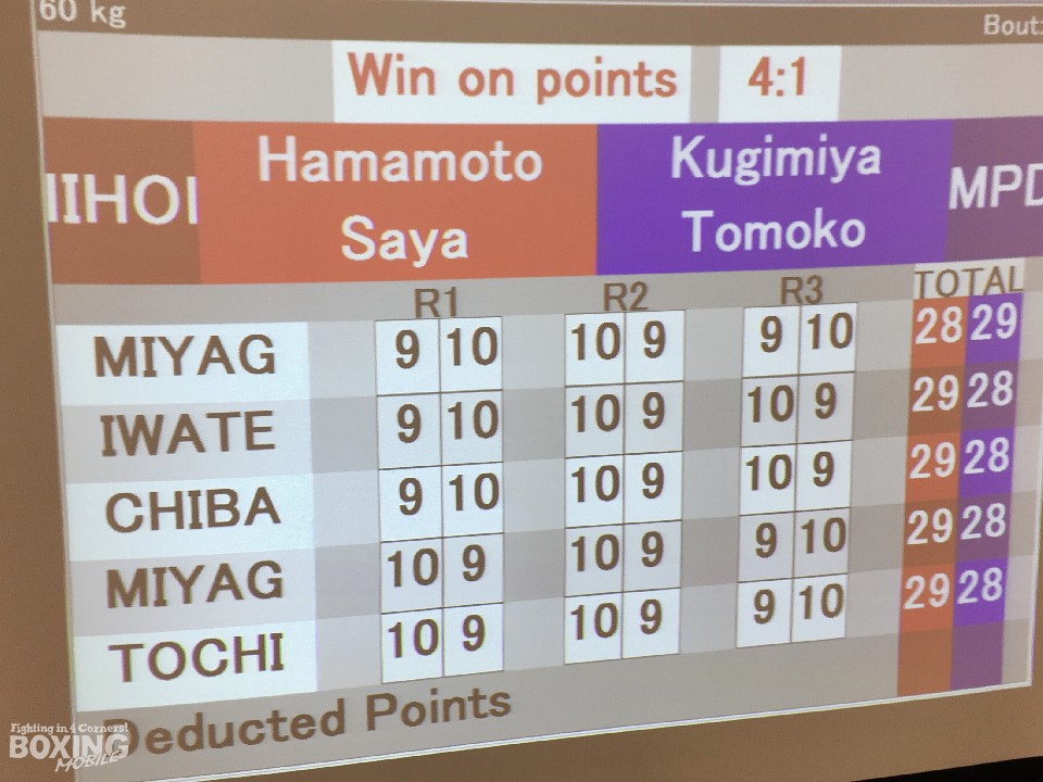 女子では今大会から採用されたバウトレビューを青コーナーが申請し、ビデオでの再検証となったが、判定は覆らず濱本の勝利となった。