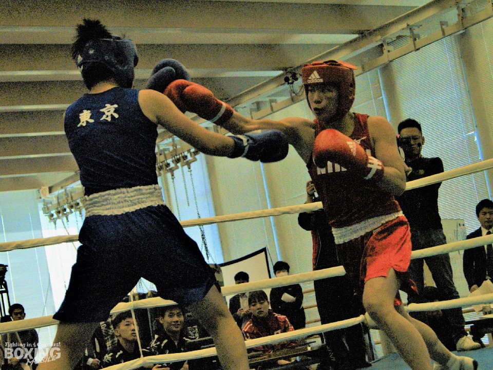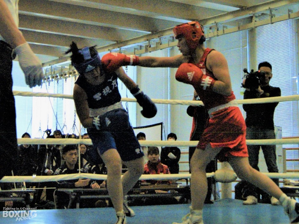 濱本はバンタム級からオリンピック階級のライト級に転向し全日本選手権を制覇。今大会で唯一、世界選手権代表者同士の戦いとなった。試合はサウスポーの釘宮が動きの固い濱本の隙をつきスピードのあるコンビネーションで先制。濱本も釘宮の打ち終わりに打つ、延びのある右ストレートで対抗。中盤になると濱本の右が度重なりヒットしポイントを重ねた。終盤、一進一退の攻防、手数の釘宮か、アグレッシブに攻める濱本かー、難しい判定は濱本の勝利を支持した。
