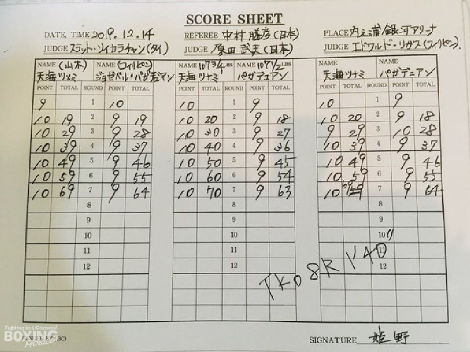 WBO(世界ボクシング機構)女子ライトフライ級王者の天海ツナミ(35=山木)が14日、鹿児島・内之浦銀河アリーナで開催された「KAGOSHIMA SOUL BOX」のメインイベントで挑戦者のジェシーベル・パガデュアン(34=フィリピン)を相手に2度目の防衛戦に臨んだ。鹿児島での世界戦は女子としては初めて、男子を含めても約43年ぶりとあって、テレビカメラが入るなど、地元メディアも多く集まった。日本に2カ所しかないロケットの打ち上げ基地がある内之浦で天海は、地元のファンの大声援を浴びた。