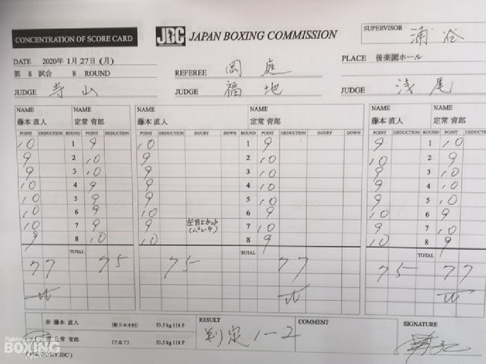 サウスポー定常がスピードを生かした攻撃で攻め立てるのに対し、藤本は右カウンターで対抗。定常が上下に打ち分け見栄えの良さをアピールしたが、タフな藤本も右フックを決めてしぶとさを見せた。7回、定常は左ストレートで左目上を切り裂くとサイドに回ってワンツーをヒット。最終8回は激しいパンチの交換を見せて試合終了のゴングを聞いた。ジャッジは割れたが定常を支持した。