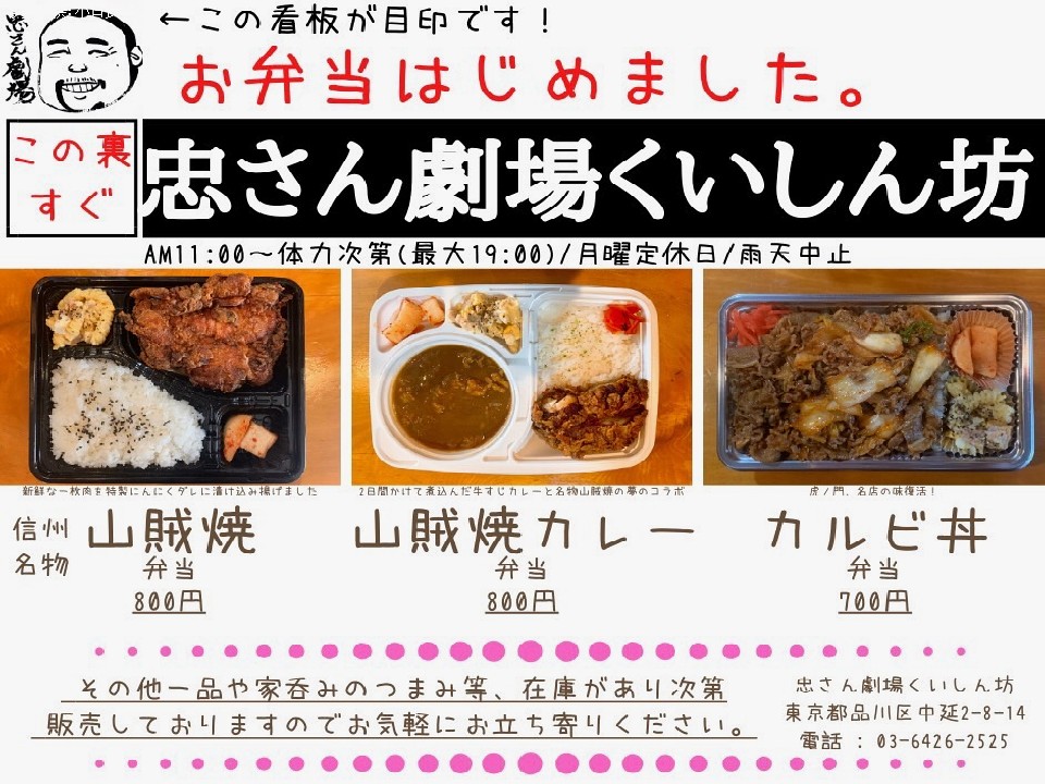 ワタナベジムの小口忠寛トレーナー(50)がオーナーを務める居酒屋「忠さん劇場 くいしん坊」が4月上旬からテイクアウトを始めている。長野県中信地方の郷土料理「山賊焼」(鶏もも肉)を豪快に乗せた山賊焼弁当などを販売。その他一品料理も在庫があり次第販売しているとのことだ。