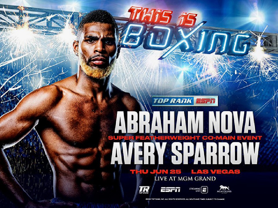 またスーパーフェザー級超の132ポンド(59.8kg)契約10回戦。WBA同級6位アブラハム・ノバ(26=米)vsエイブリー・スパロウ(26=米)が、セミ格で組まれトップランク社がプロモート、ESPNが中継を行った。
