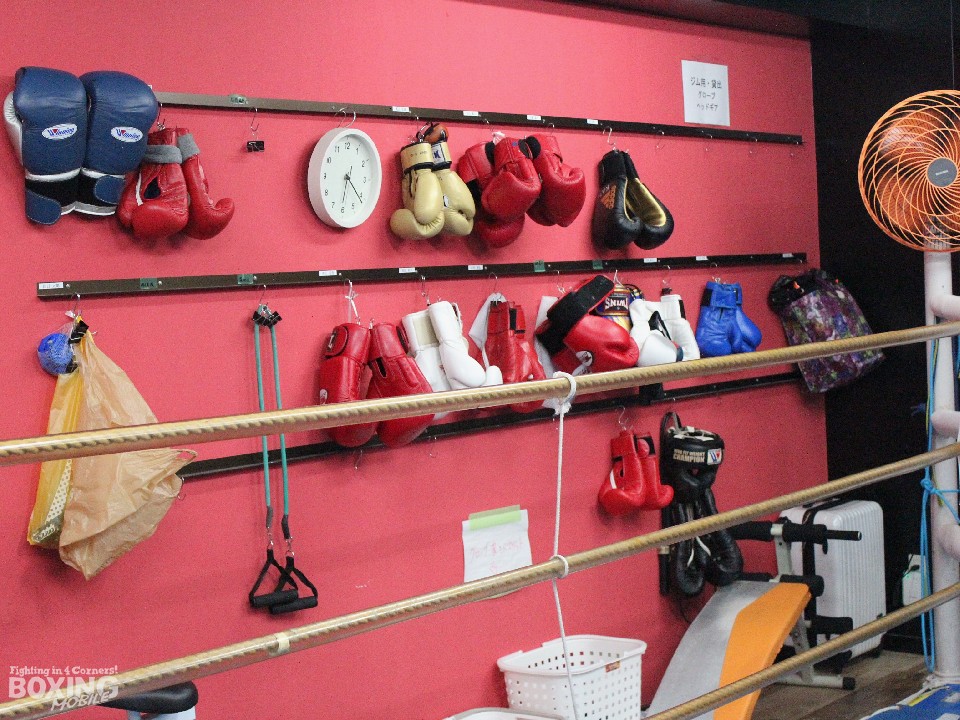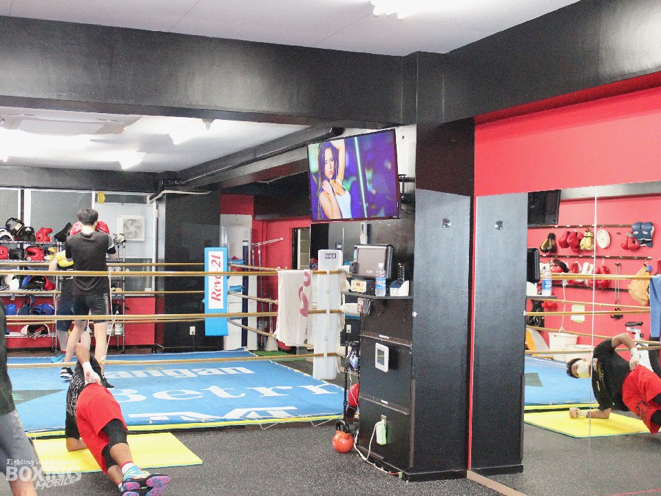 ジム中に入ると赤と青を交互に並べたサンドバックが5基、さらにモニターを設置し映像を流していた。リング横にはグローブをかけるスペースを作り、グローブドライヤーも置いてあるので清潔な状態を保つことができる。エアコンと業務用扇風機で換気状態にも気を配っている。瀬端幸男会長は、「これから網戸も張り替えてより換気に気を付けたい。環境を良くして新しい練習生を迎えたい」と、新型コロナ感染対策にも万全のようだ。