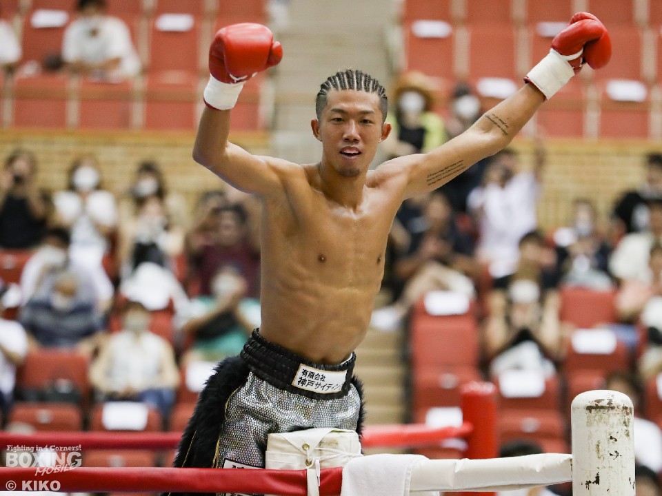溝越斗夢(21=緑)と対戦した高原は、初回からプレスをかけて右ストレートで迎え撃つと、3回に強烈な右でキャンバスに沈めた。