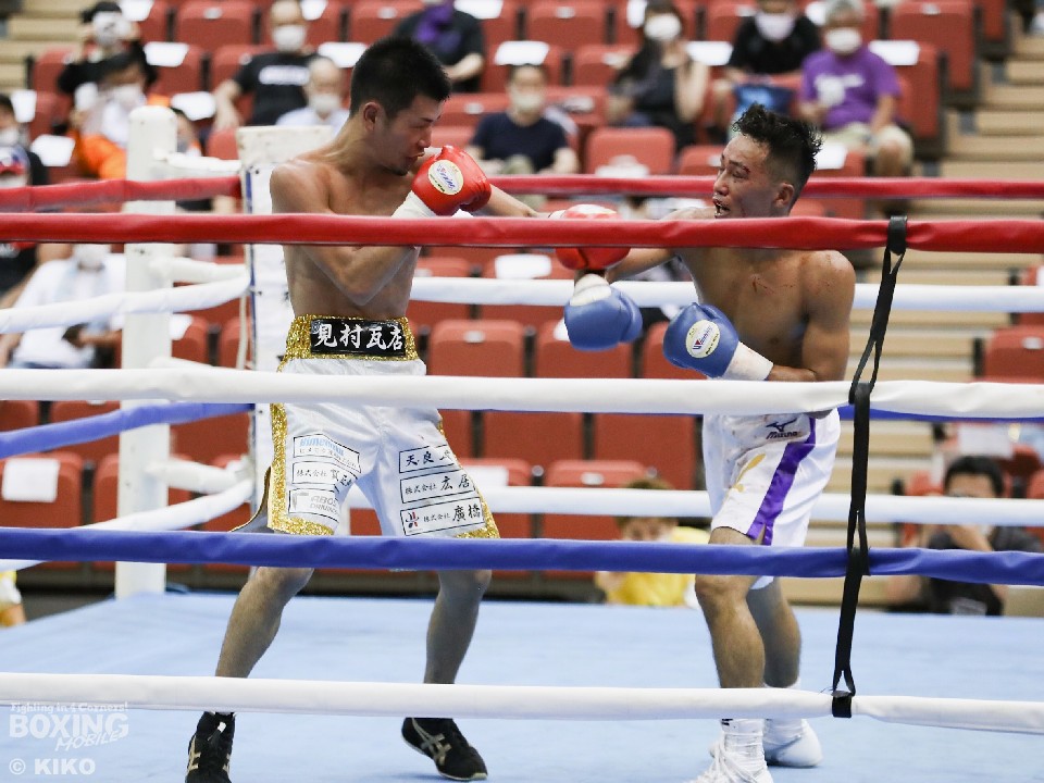 セミファイナルではフライ級8回戦で見村徹弥(24=千里馬神戸)と井上夕雅(21=尼崎亀谷)が対戦。見村がジャブを浴びせて先制攻撃に成功したが、井上のボディ攻撃に失速。体力を消耗しロープを背負いながらも懸命にパンチを返したが、井上の圧力に判定負けを喫した。