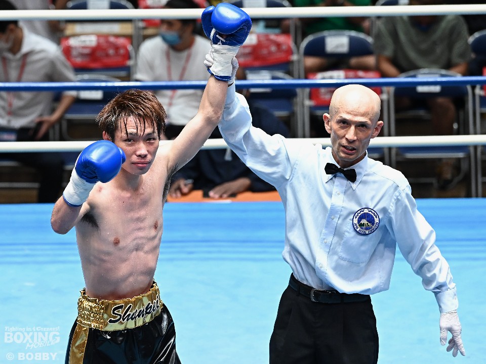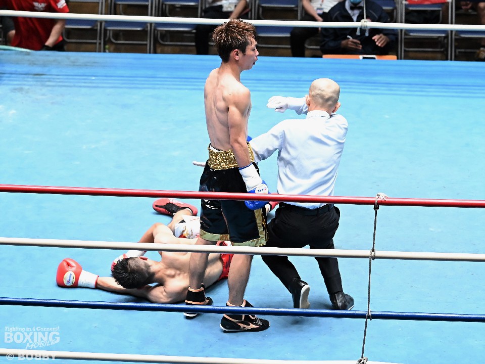 第8試合では阿部愛斗(19=石神井スポーツ)が大森建太郎(35=イマオカ)に初回17秒でKO勝ちし会場に衝撃を与えた。