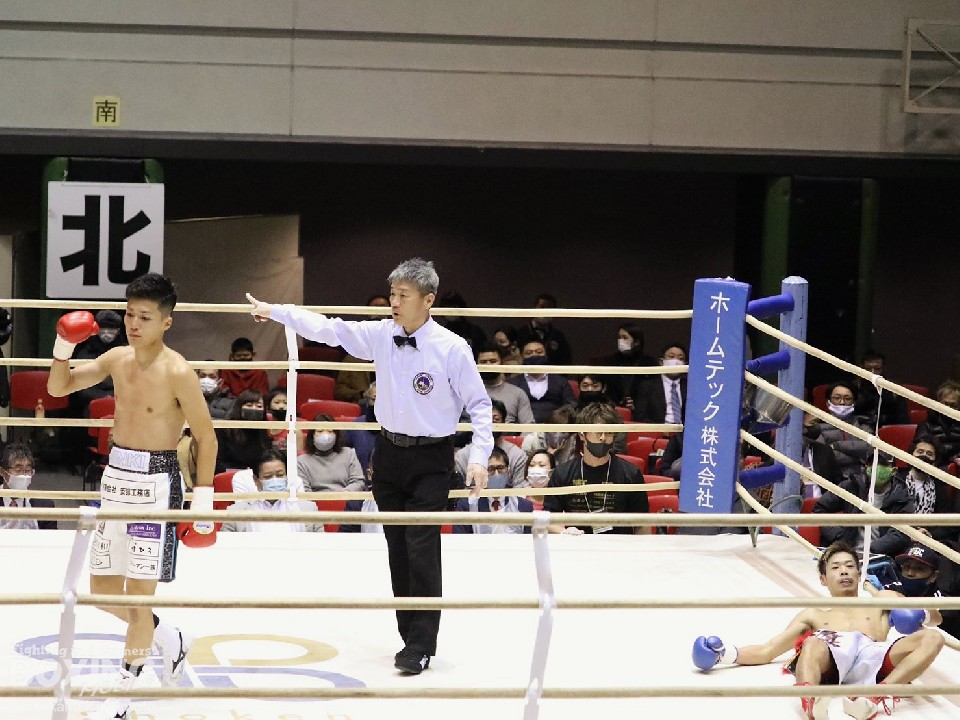 初回こそ距離の探り合いで静かな立ち上がりとなったが、2回にサウスポー前田の左ストレートが炸裂!大久保を豪快にキャンバスに沈めた。