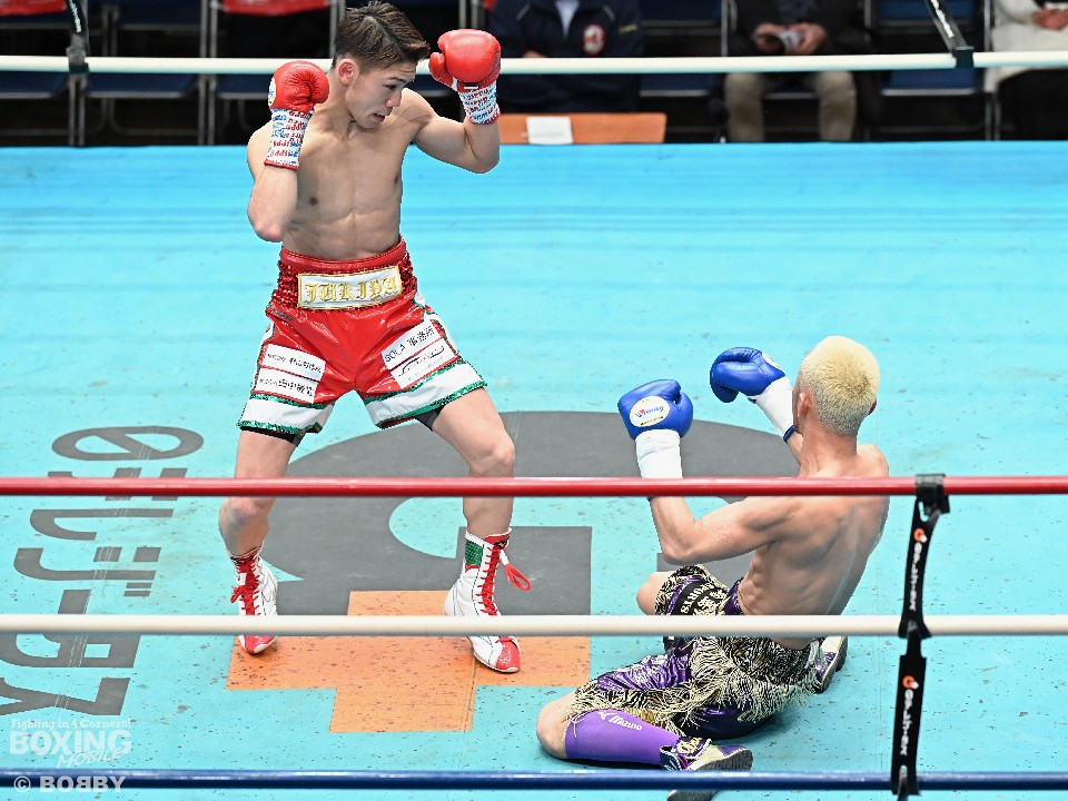 立ち上がりから飯村はプレスをかけて試合を組み立てると右カウンターでダウンを先取。再開後、サウスポー山田を冷静に追い詰めると、再び右カウンターを炸裂させてキャンバスに沈めた。
