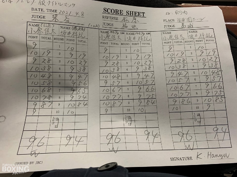 小原が右ボディストレートで勝利を引き寄せた。序盤は、坂井の硬いガードに手を焼いたが、右ボディストレートを決めて突破口を開いた。前半終了時の公開採点は2-1で小原がリード。坂井は距離を詰めて右フックでグラつかせたが、小原も右ボディ、右アッパーを好打しペースを渡さなかった。2ポイント差をつけた小原が激戦を制した。