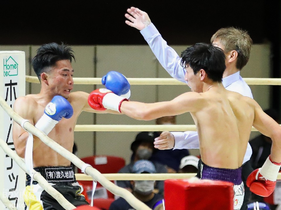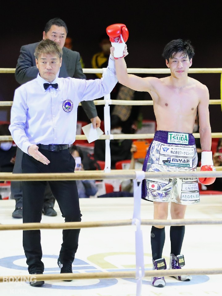 自主興行初のメインイベンターを務めた下町がタイトル挑戦を大きくアピールした。サウスポー下町は、ジャブでリズムを作ると左ボディアッパー、ワンツーでペースを掌握。照屋はボディを叩き反撃に転じるが、下町は落ち着いた試合運びを見せると3回に逆ワンツーから連打を浴びせてフィニッシュした。