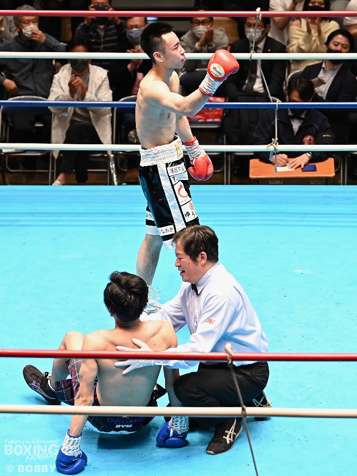初回は、田之岡がジャブから左ストレートを繰り出し先制攻撃を仕掛けるが、川浦は冷静に対応すると左カウンターのタイミングを図った。勝負が決まったのは3回。川浦は左ストレートを決めて痛烈なダウンを奪うとレフェリーはノーカウントで試合をストップした。
