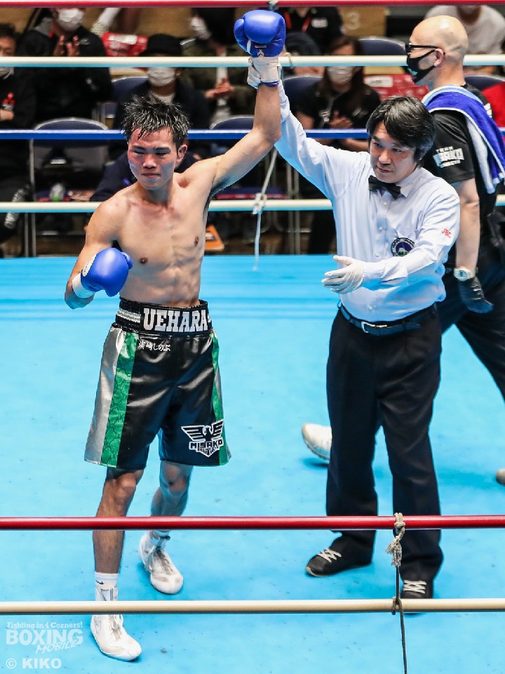 ダウンを奪われた上原が後半に猛追し逆転勝ちした。サウスポー同士の一戦は、5回に石井が右ボディを突き刺しダウンを奪った。ゴングに救われた上原は万事休すかと思われたが、6回になると息を吹き返しペースを掌握。7〜8回も回転力を活かした連打でポイントを奪った。上原が、2018年12月にOPBF東洋太平洋フェザー級王者の清水聡(大橋)に3回TKO負けを喫して以来の復帰戦を勝利した。