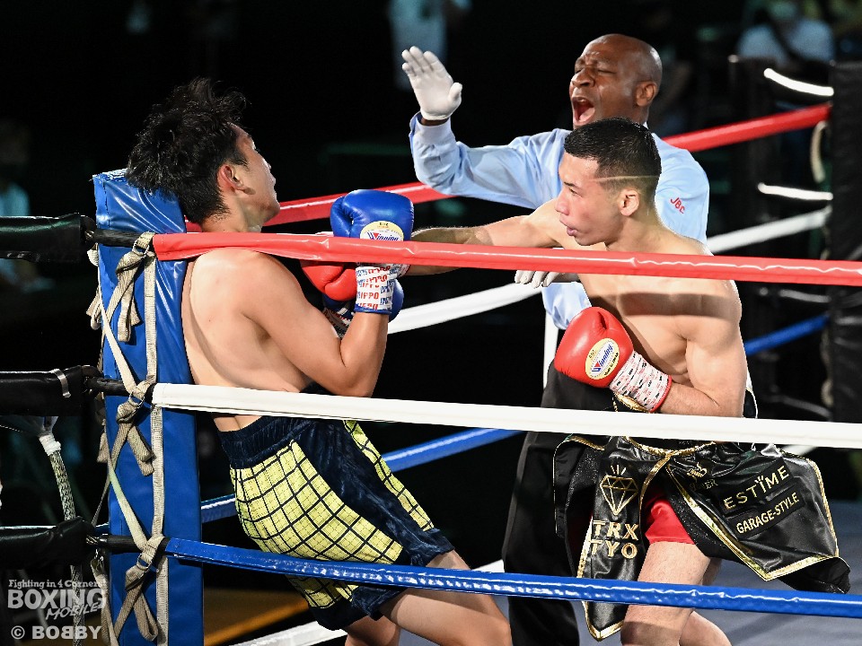 開始から渡部が距離を潰して左ボディ、左フックを好打しペースを掌握。打ち合いに持ち込むと豊富な手数で圧倒。ラウンド終盤にコーナーに釘付けにして怒涛の連打でレフェリーストップに持ち込んだ。