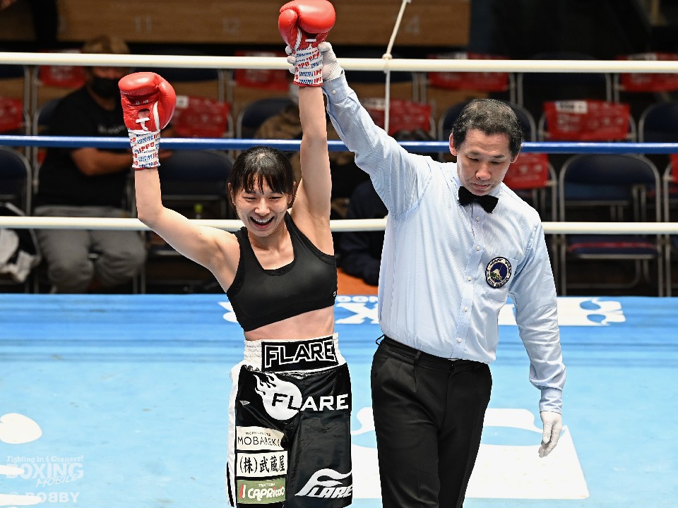 「友人に誘われて」と2年前に近所にあるFLARE山上ジムに入門。赤井祥彦代表や上原健太郎トレーナー勧められたのと、「映画「100円の恋」の主人公(※自堕落な生活を送っていた32歳女子がプロボクサー目指す物語)と自分がリンクして」と、プロボクサーを目指すようになり昨年12月にプロテストに合格した。