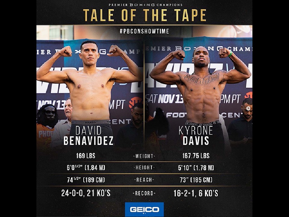 ベナビデスは契約体重169ポンド(76.6kg)をリミットでクリア。対するデイビスは600gアンダーの76.0kgで秤を降りた。