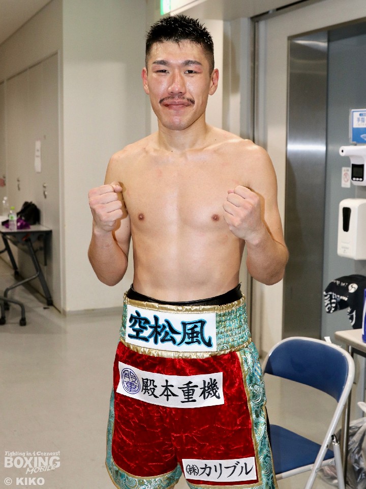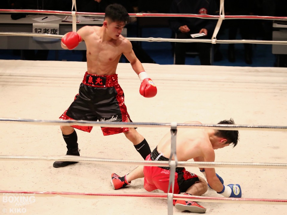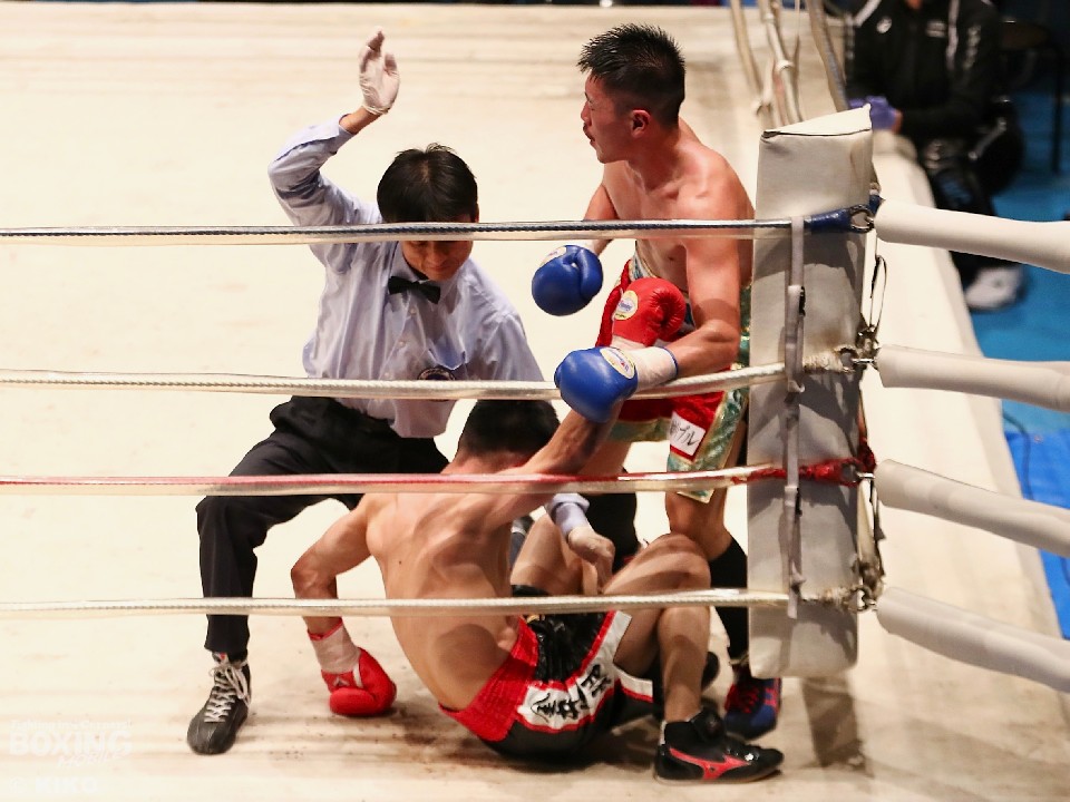 殿本がランカーの力を示して最後はしっかりと仕留めた。殿本は、3回に右クロスで腰を沈めさせると4回にコーナーに押し込み連打で攻勢。しかし、金井も左フックで膝を揺らし反撃した。ジャブから組み立てた殿本は、7回に上下のコンビネーションでペースを維持。最終8回に右クロスから連打でダウンを奪って試合を終わらせた。
