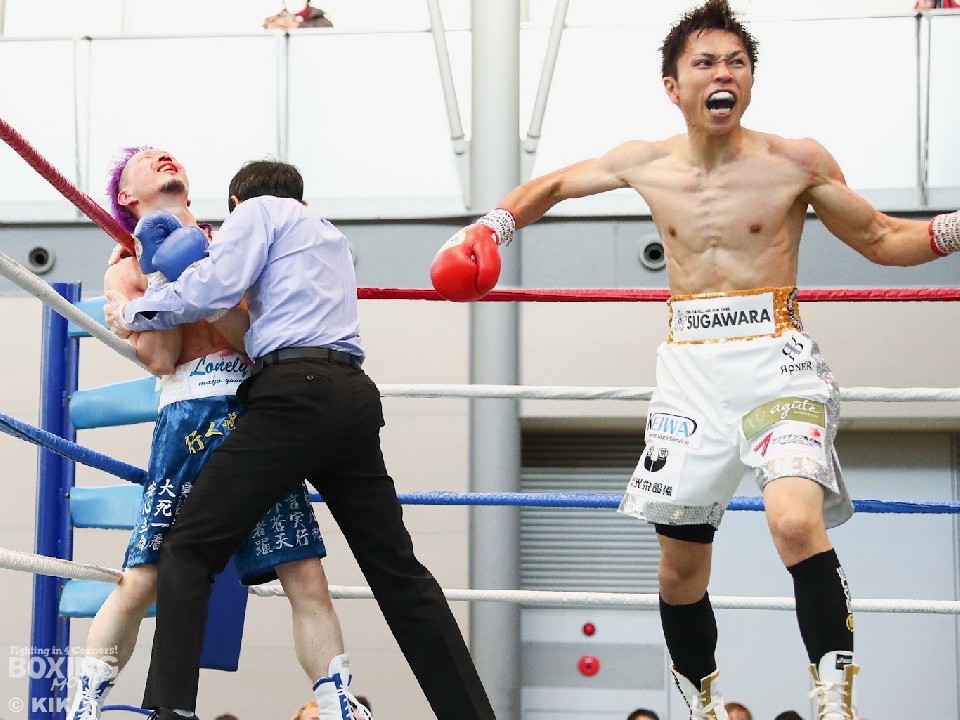 ジャブで距離の探り合いから中里が右カウンターを好打するが、菅原はフェイントをかけながらジャブで何度も差し左ボディを突き刺した。お互いにパンチが交錯する緊張感あふれる展開になると、菅原が左ボディで効かせて一気に仕掛け、猛攻に耐えきれず止まった中里を見てレフェリーが試合を止めた。