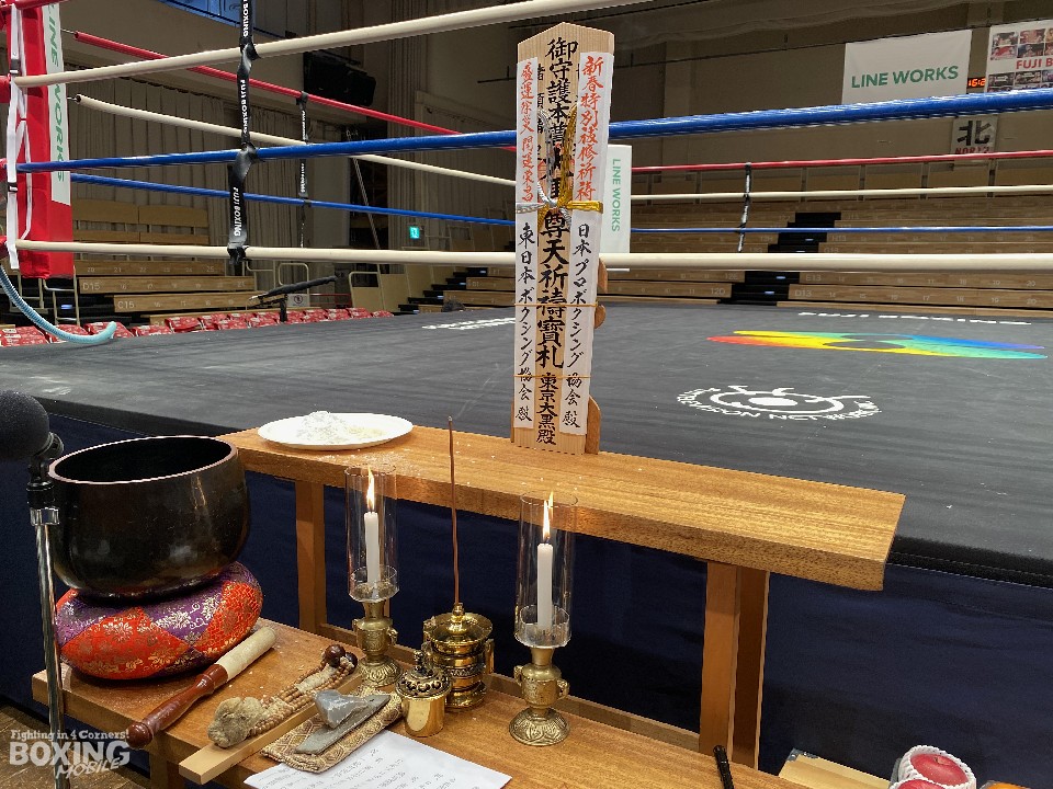 令和4年1月11日(火)、最初のボクシング興行が開催される後楽園ホールで、開場前にお清め式が執り行われた。リング上には日本プロボクシング協会、東日本ボクシング協会の花形進協会長をはじめとする各理事、日本ボクシングコミッション役員が並び、秘妙山・東京大黒殿の住職によりすべての選手、練習生、また関係者の安全と発展が祈願された。