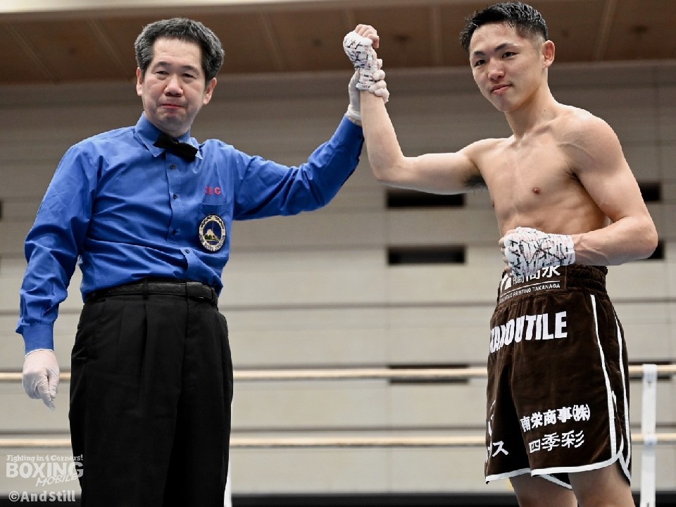 世界を見据える加納が、ライトフライ級のWBO-AP王座を返上し、フライ級に上げて臨んだ最初の試合。前に出てきたサンチャイに対して、左ボディストレートから、パンチをまとめた加納が最初のダウンを奪うと、左ストレートでダウンを追加。最後はパンチをまとめてレフェリーストップを呼び込んだ。ステップとジャブのタイミングも光った加納がフライ級初戦を完勝で終えた。