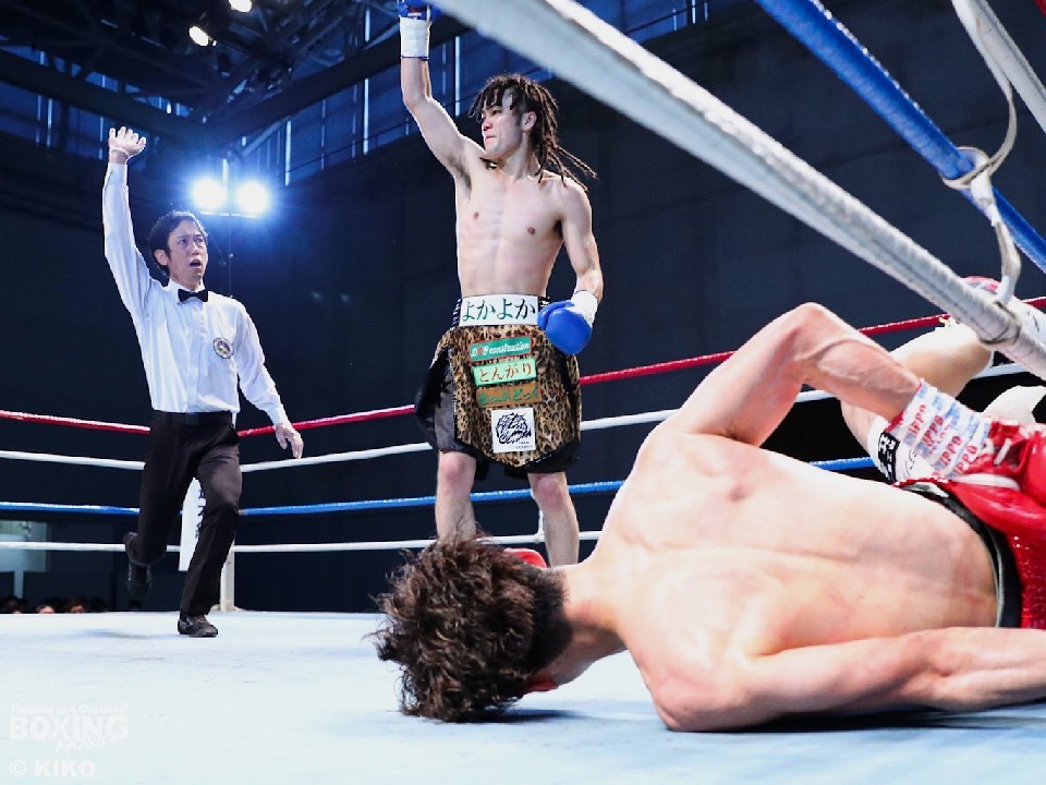 距離の探り合いから大保がプレスをかけ、サウスポー菅原がスピード感ある攻撃を展開。3回、大保は左フックをジャストミートしダウンを先取。試合が決まったのは4回。揉み合いの中、大保が左フックで再度倒すと、ダメージの深さを見てレフェリーが即座に試合をストップした。