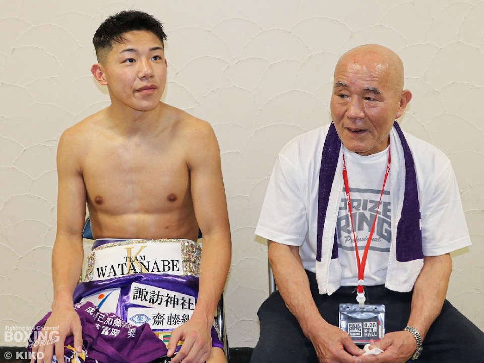 試合後に囲み取材に応じた渡邊は「ジャブを避けないので(勝利を)確信した。ワンツーが顎に入って効いたのがわかったので、このラウンドで決めようと思った。とにかく相手の顎を打ち抜くことを心掛けて、フルパワーで仕留めにいった」と会心の勝利に笑顔を見せた。