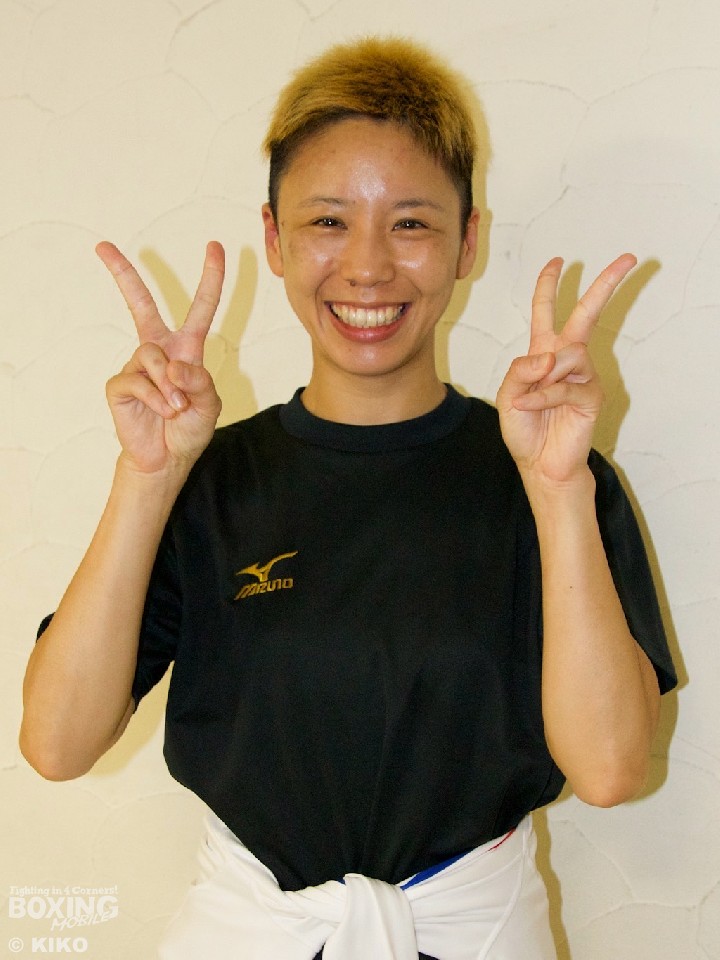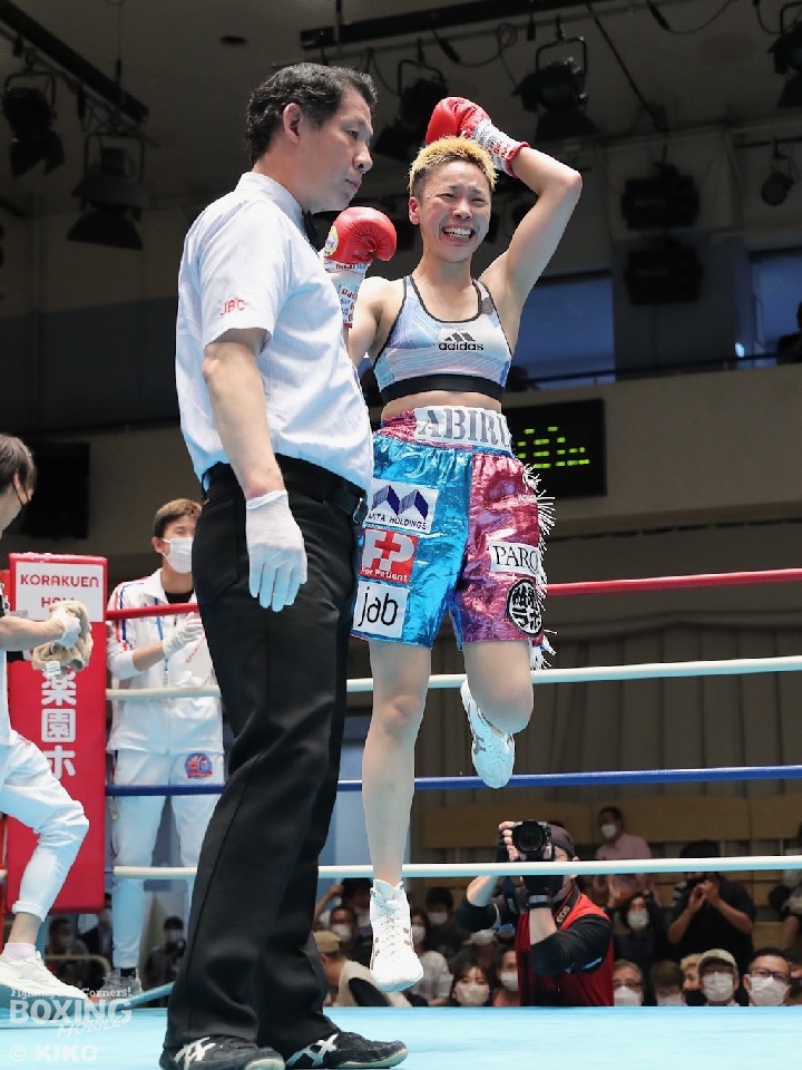 元世界王者を撃破した阿比留は「やってやりました!」と声を弾ませた。「私がファイタータイプなので、相手は足を使ってくると想定していた。距離を取られてもどこかで捕まえようと思っていた。もっとボディを打ちたかったが、これまでの試合と比べたら良い動きだったと思う」と殊勲の勝利に胸を張った。