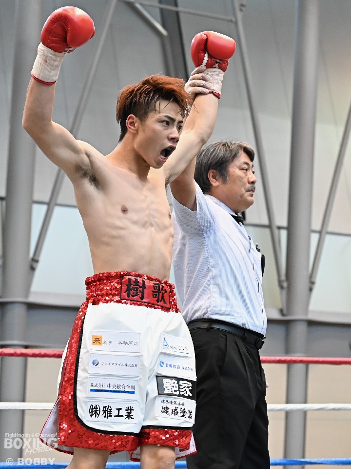 樫谷が、初回に左ボディから右ストレートを決めてダウンを演出。倒しにかかったが、相手の左フックでバランスを崩し、ピンチに陥った。しかし、2回に左ボディから左フックをフォローし、2度目のダウンをゲット。再開後、左右をまとめて、レフェリーストップに持ち込んだ。