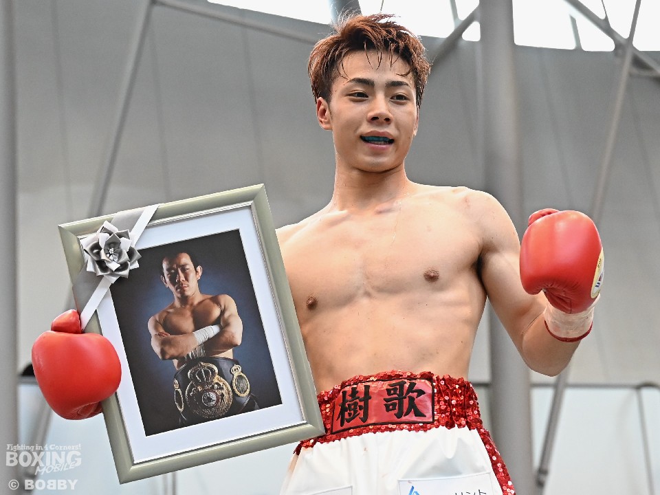 第5試合、56.0kg契約4回戦では、樫谷樹歌(20=TIGER WING)と満生敦巳(23=オキナワ)が対戦。元WBA(世界ボクシング協会)ミニマム級王者の故・星野敬太郎の下でボクシングを始めた樫谷が、初回にダウンを奪った。