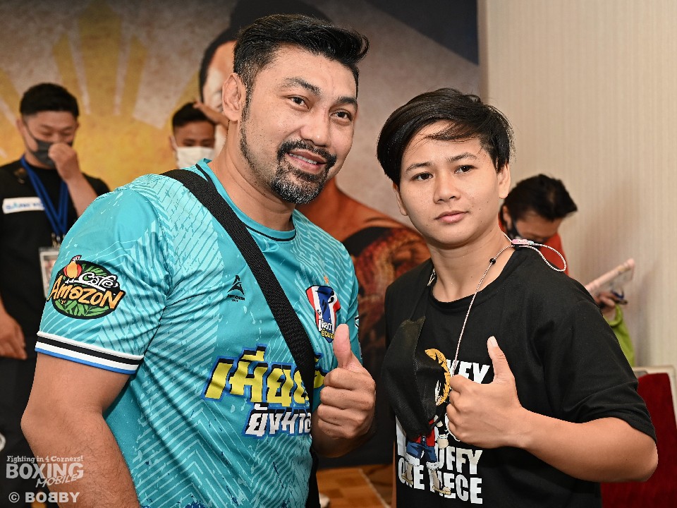 サオラックのトレーナーを務めるのは、元世界2階級制覇王者で、かつて辰吉丈一郎氏と対戦した、シリモンコン・シンワンチャー氏だ。リングアナウンサーに紹介されると笑顔を見せた。