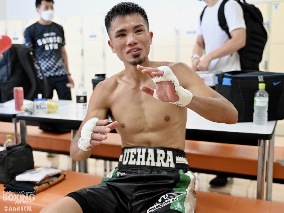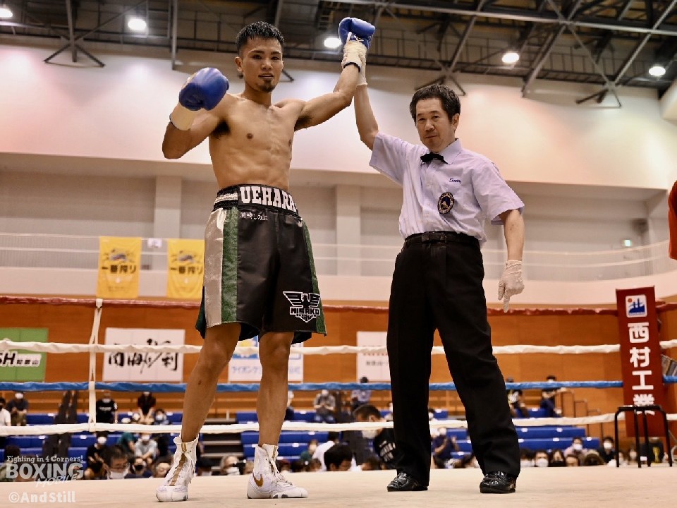 サウスポー同士の一戦は、竹本が左ストレートを打ち込むと、上原はジャブから左ボディストレートに繋げて対抗。ジャブでプレスをかけた上原は、右ボディブローを好打。積極的な攻撃でペースを掴むと、3回にコーナーに詰めてボディにパンチを集め、試合を終わらせた。
