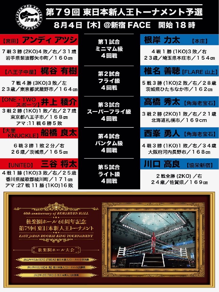 8月2日から3日連続で開催中の東日本新人王トーナメントの前日計量が3日、都内のJBC(日本ボクシングコミッション)事務局で行われた。この日は、4日に試合を迎える10選手の計量が行われた。試合は、新宿FACEで行われている。