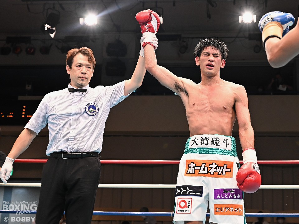 日本スーパーバンタム級9位の大湾硫斗(24=志成)が30日、後楽園ホールにセットされたスーパーバンタム級8回戦のリングに上がった。鋭い踏み込みで、強引に入ってくるOPBFランカーでサウスポーのマーク・アンソニー・ヘラルド(31=比)を、左右のコンビネーションで封じていた大湾だったが、レフェリーが中に入ってストップした後に、アクシデントが待っていた。