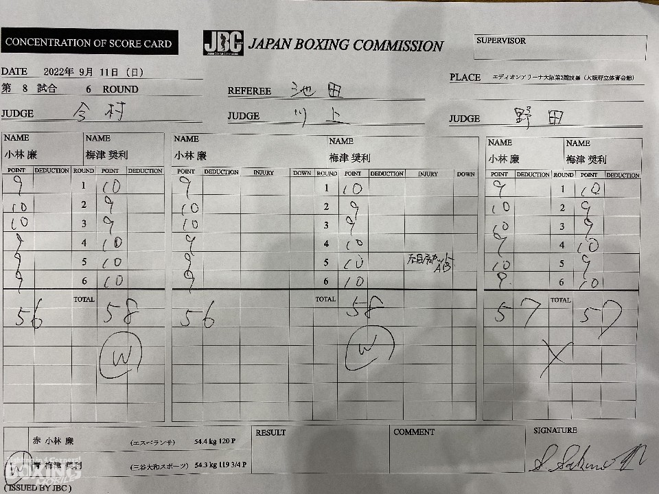 序盤は、小林がジャブから左ボディにつなげて、ジャッジに攻勢をアピール。梅津も、上下のコンビネーションで応戦した。4回、ギアを上げた梅津は、豊富な手数で押し込み、攻勢。後半もサイドに回り込んで、ショートパンチで攻め立てた。ジャッジ2者の支持を得た梅津に、軍配が上がった。