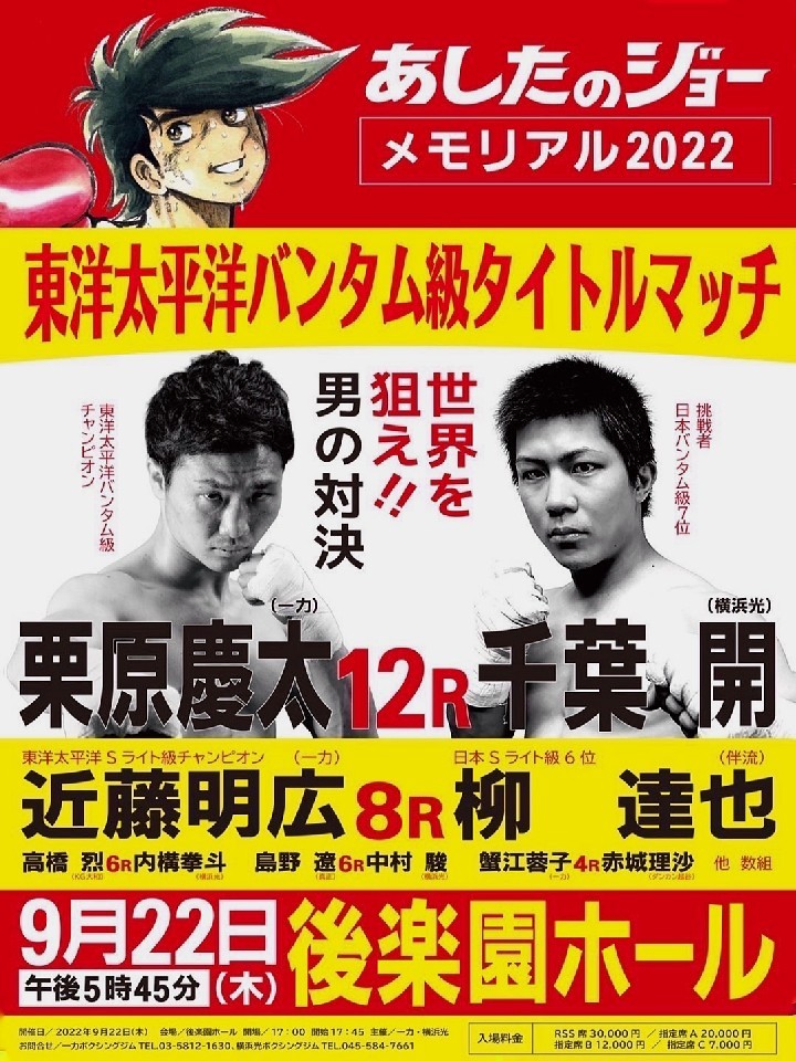 注目選手達が名を連ねる、激アツのバンタム級。OPBF東洋太平洋王者の栗原慶太(一力)に挑戦する千葉開(横浜光)は、9月22日(木)の試合が、自身2度目のタイトル挑戦。国民的漫画「あしたのジョー」メモリアル大会が盛り上がってきた!