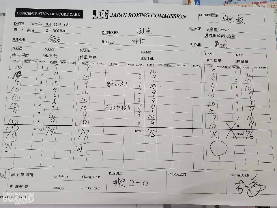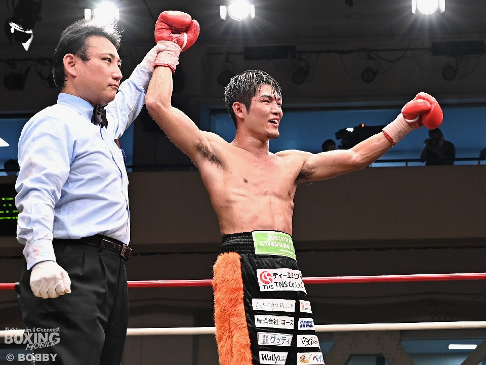 序盤は、鯉渕がグイグイと前に出て、左右フックをヒット。巻き込まれそうになった仲里だが、ジャブから左ボディにつなげてペースを取り返すと、中盤は左フック、左ボディを決めて、ポイントを連取。7回に鯉渕の連打を浴びたが、最終8回に打ち勝ち、勝利を掴んだ。