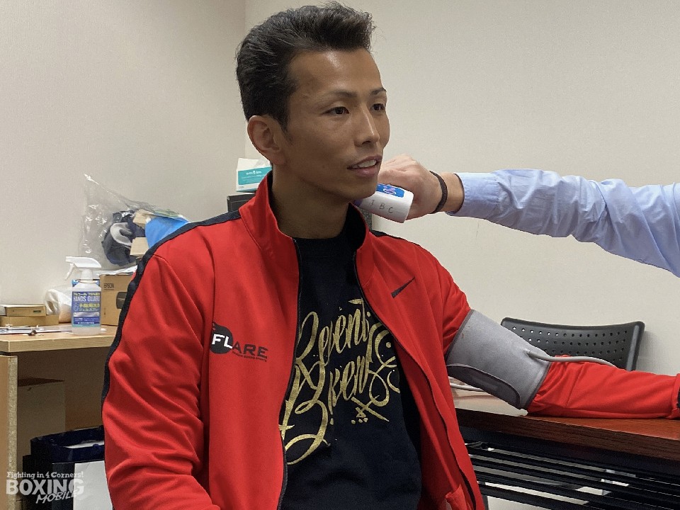 先に秤に乗った和氣は、フェザー級リミットを100g下回る57.0kgでクリア。スーパーバンタムを主戦場としている和氣だが、今回は1階級上での試合となる。「最後の最後まで、しっかりと追い込むことができた」と仕上がりの良さを強調。明日で38戦目を迎えるサウスポーは、いつも通り落ち着いていた。
