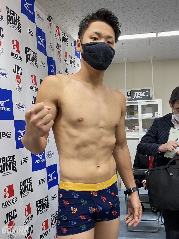 OPBF王座初防衛戦に臨む竹迫は、ミドル級リミットちょうどの72.5kgでクリアした。今年9月のノンタイトル戦で3回KO勝ちしてから、わずか2ヶ月間隔でリングに上がる。「前戦は、ブランクがあり(1年4ヶ月ぶり)強引に倒しにいってしまった」と振り返ると、「短期間で、細かい部分を修正することができた」と成長を実感していた。