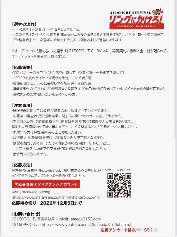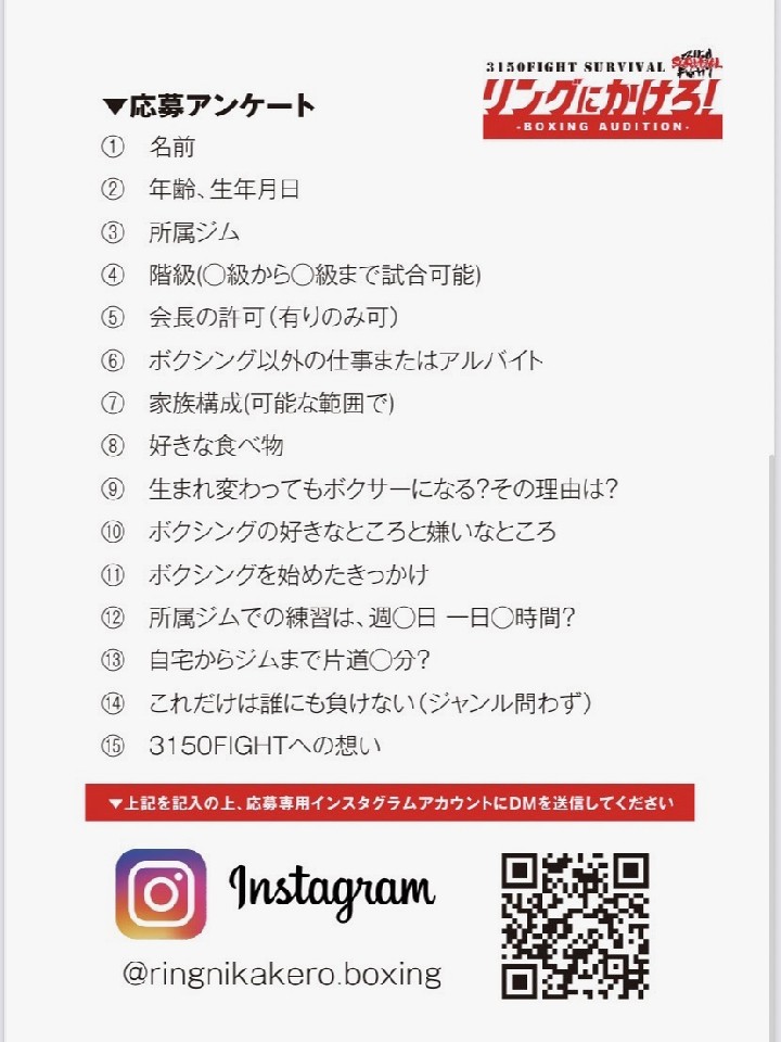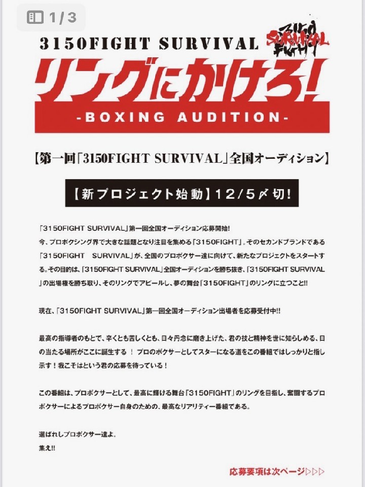 第1回「3150 FIGHT SURVIVAL」全国オーディションの応募が始まった。21日、亀田興毅ファウンダーとワタナベジムの深町信治マネージャーが正式に発表した。
