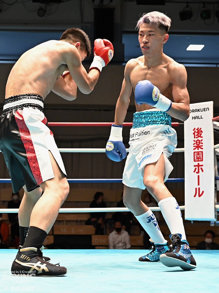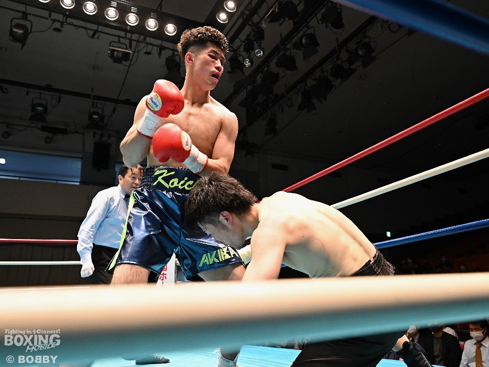 開始早々、サウスポー山田の右フックを浴びた宮崎だが、臆することなく前に出てワンツーを好打。しかし、相手の左ストレートを浴びて、右目下を腫らした。2回、激しく打ち合う中、宮崎が右ストレートでダウンをゲット。3回、お互いフラフラになりながらもパンチを繰り出す中、宮崎の右ストレートが火を噴き、2度目のダウンを演出。再開後、パンチをまとめて、レフェリーストップに持ち込んだ。