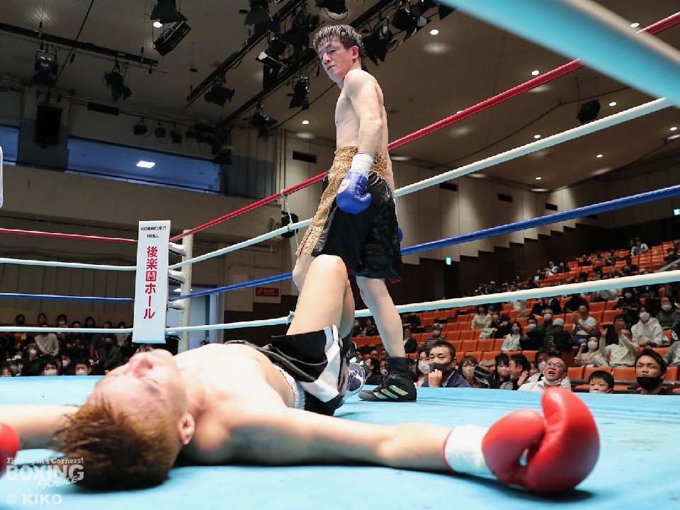 久しぶりのリングの感触を確かめるように、ジャブから入る斉藤に対し、サウスポーのアヌーチャはプレスをかけて、アグレッシブに攻めた。動きが硬い斉藤だが、3回に右ショートで痛烈なダウンをゲット。立ち上がったアヌーチャだったが、足元がふらつきレフェリーストップとなった。