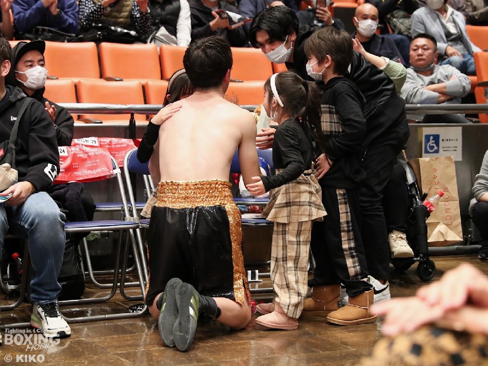 斉藤は、愛する家族へ感謝の気持ちを言葉にした。「試合に向けて、子どもたちは手伝いをしてくれたりと、本当によく頑張ってくれた。この後は、いっぱい甘えさせてあげたい」。試合後、リングを降りると家族と抱き合い勝利をわかちあった。