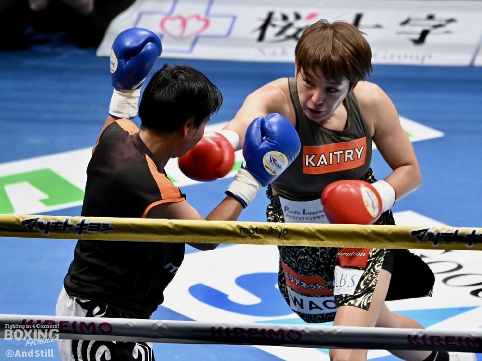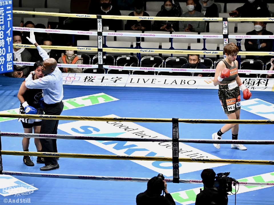 KO勝利を目指すとした伊藤が、勝負を決めたのは4ラウンド。距離を詰めてワンツーでダウンを奪うと、立ち上がったワッサナにパンチをまとめて、レフェリーストップを呼び込んだ。