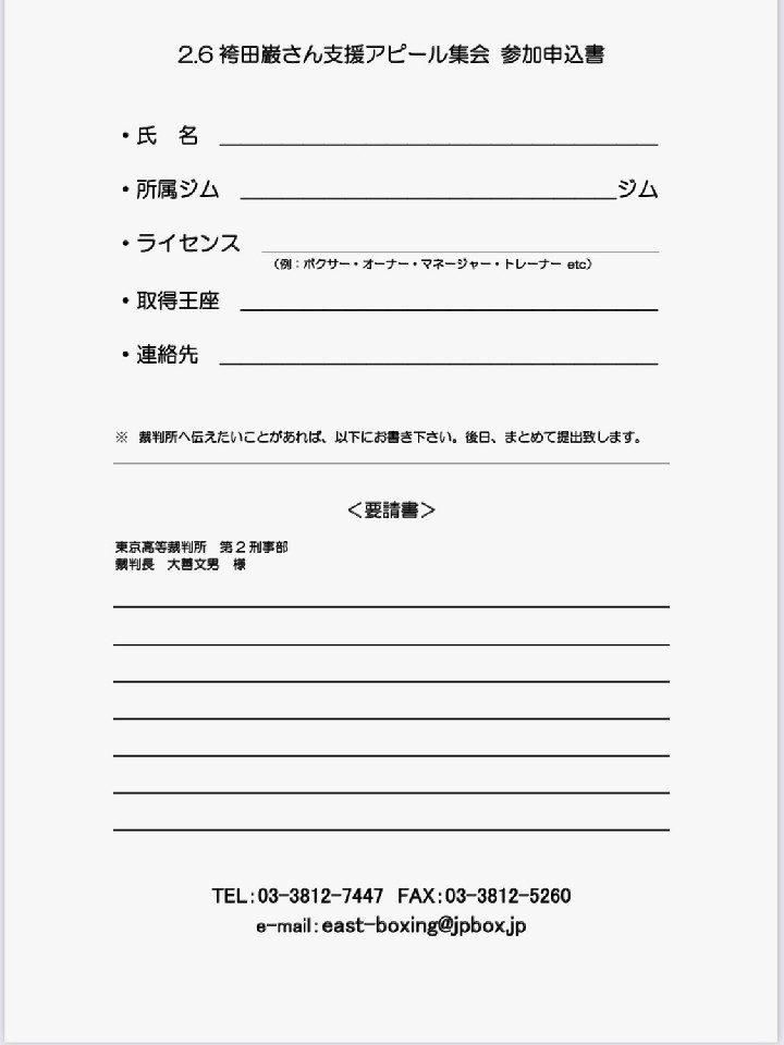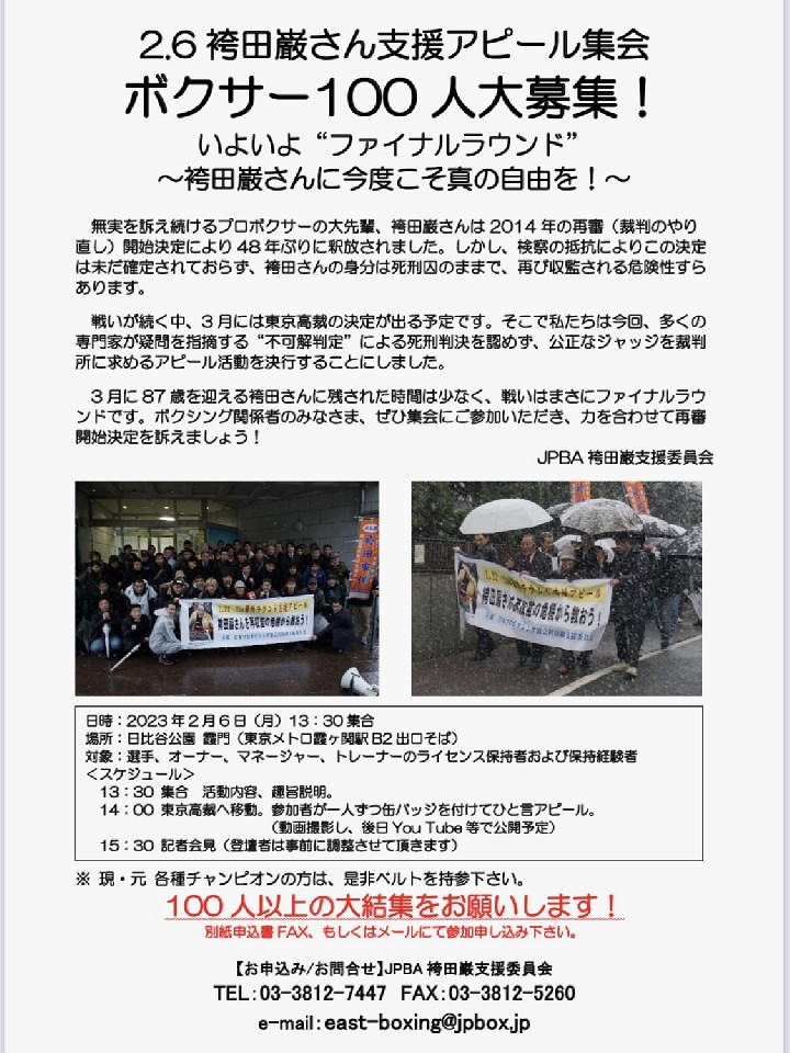 今年3月に東京高裁が、差し戻し審の決定を出す予定があることを受けて、2月6日(月)、東京高裁前でアピール活動を行う。同委員会では、選手、トレーナー、マネージャー、オーナーのボクシングライセンスの保持者、または元保持者の参加を呼びかけている。