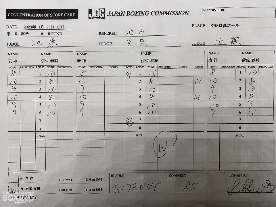 初回、伊佐が右カウンターでダウンを奪う、絶好のスタート。後手に回った表だが、2回に右ストレートをねじ込み、倒し返した。4回には右カウンターでダウンを追加し、ポイントで引き離した。5回、接近戦に持ち込んだ伊佐は、ショートパンチで反撃に出ると、7回にワンツーで2度目のダウンを演出。再開後、パンチをまとめて試合を終わらせた。