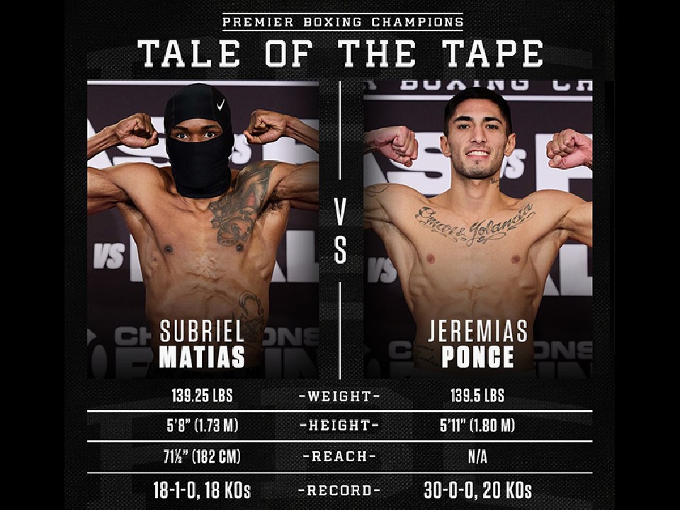 スーパーライト級のリミットが63.5kgなのに対して、ポンセは200グラムアンダーの63.3kg、一方、マティアスは400グラム下回る63.1kgでクリアした。