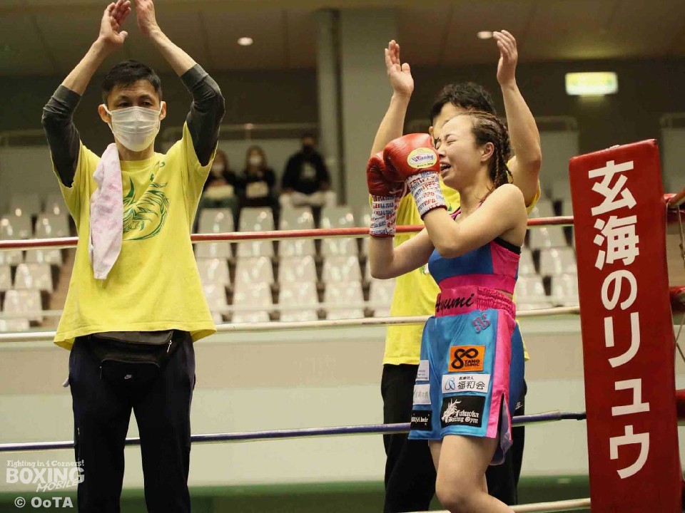 田中は、初回から豊富な手数で、テンポの良い攻撃を仕掛けて主導権を握ると、ワンツー、右ストレートでポイントを着実に重ねて最後まで攻め続け、4戦目で初勝利を掴んだ