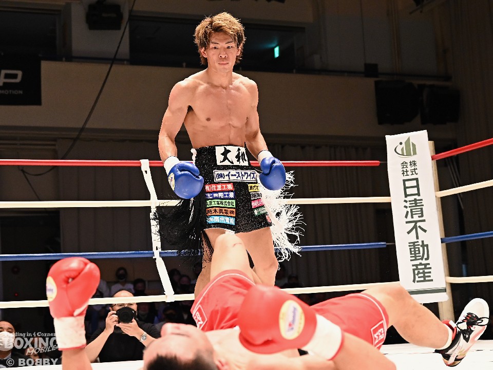 サウスポー波田が左ボディストレートから仕掛けると、ガオは打ち終わりに左フックで対抗。2回になると、波田は上下に打ち分けペースを掌握。右フックで左目上を切り裂いた。勝負が決まったのは3回。波田は左ショートで痛烈に倒し、10カウントを聞かせた。