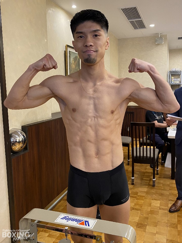 元世界3階級制覇王者の田中恒成(27=畑中)が20日、名古屋市内のホテルで前日計量に臨んだ。
